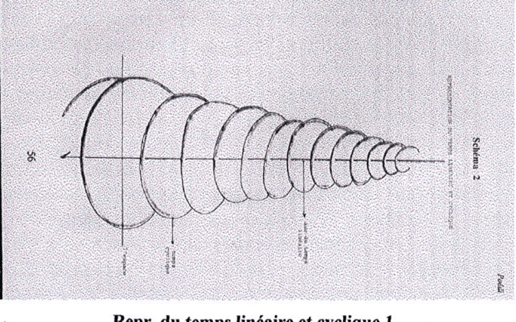 J’existe dans un temps linéaire, par rapport à mes liens de parenté, moi, mes parents, mes grands-parents et mes-arrière-grands-parents. Aujourd’hui, le temps cyclique est une succession d’événements sociaux ou professionnels qui font mon vécu. Ces temps cyclique et linéaire vont m’aider dans la construction de ma personne, mon identité, de mes relations avec mon environnement. Et qui plus est cette notion de temps cyclique serait liée à celui de la vie. Cette dernière ne s’arrête jamais, il y a une vie après la mort. Nous rejoignons le monde des vieux dans le monde invisible, vers une quête de perfection, vers l’être, qui nous amène au temps absolu. Ce dernier est atemporel, il se détache de l’espace et du temps physique et linéaire. C’est le temps inaliénable. Le temps de l’être.