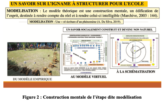 Le deuxième cliché (fig. 2) donne une orientation. Il s’agit ici de présenter comment, avec méthode, à partir d’une pratique du réel, la modéliser ou la transformer en objet virtuel ou mental. Marchive souligne : « Le modèle théorique est une construction mentale, une édification de l’esprit, destinée à rendre compte du réel et à rendre celui-ci intelligible. Ce modèle n’est cependant pas n’importe quel type de discours sur le monde : ce n’est pas un discours métaphysique, poétique ou phénoménologique se contentant de décrire des phénomènes, c’est un discours le plus souvent de type formel qui obéit à certaines règles et qui s’efforce de proposer une certaine vision du monde. Selon Tiberghien (1991 : 17) : « d’un modèle empirique, procéder à la construction mentale de l’étape dite modélisation. » (2003 : 144). Pourquoi recourir à la méthode de modélisation ? Marchive précise encore : « En vérité, […], la formation des enseignants est à l’articulation de deux mondes : le monde de la contingence et de la mise en œuvre des pratiques d’enseignement d’une part, le monde de la recherche et de l’étude scientifique des phénomènes d’enseignement d’autre part. » (2003 : 146). Ainsi, à l’heure actuelle, nous nous rendons compte que la maîtrise de cette procédure peut nous aider à notre tour à modéliser quelques pratiques sociales et culturelles insulaires, ou encore, comment, à partir du milieu, modéliser quelques savoirs en vue de construire des éléments propices à l’activité scolaire.