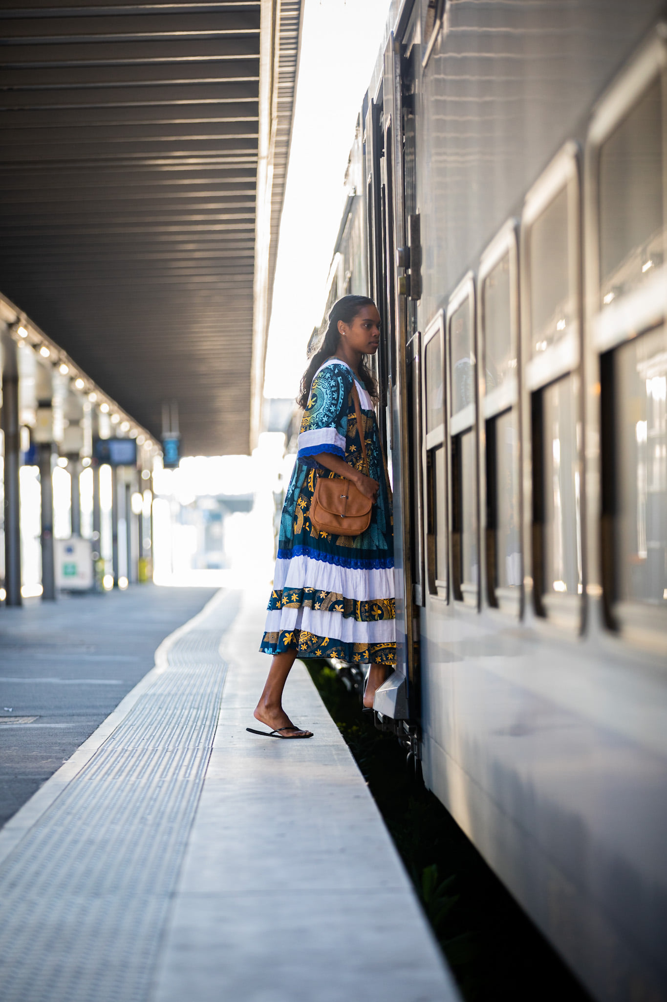 « La robe nous mènera d’une ville à une autre, d’une gare à un port, d’un aéroport à une bibliothèque ou encore d’un café à un jardin. »