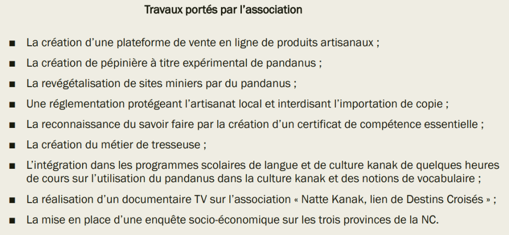 ■ Toutes études ou actions pouvant aider et participer à la connaissance, à l’enseignement, à la formation, à la protection, à l’amélioration, au développement, à la promotion et à la création de nattes kanak, de natte en général, de la vannerie sous toutes ses formes.