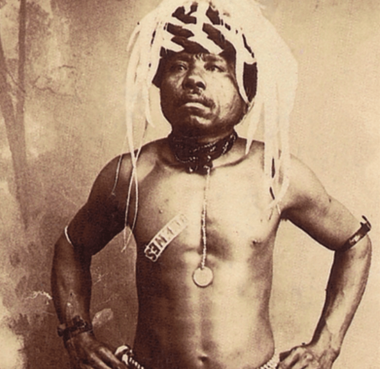 Ce cliché ressemble aussi au cliché scientifique de classement (peut-être) celle d’une espèce en voie disparition. L’homme donne l’air d’être figé comme un animal empaillé qui pourrait être placé dans un salon européen. Ici l’indigène est exhibé, il n’a pas besoin d’être vivant, c’est un « être sauvage fossilisé». Sa posture n’est pas naturelle. Autre punctum, c’est cette colonne qui semble être datée de l’Antiquité et qui inscrit cette image dans une autre mythologie celle des représentations de l’Autre.