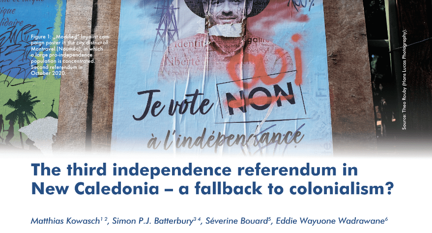 Although the vote was legal and the result was clear (96.5% voting against independence), we argue – along with various international observers – that the schedule did not respect Kanak cultural traditions and the vote should be considered as undemocratic. As engaged scholars with different scientific backgrounds (geography, agronomy, education) and of different origins (German, British-Australian, French-Caledonian and indigenous Kanak), we critically examine the circumstances of the third referendum and analyse the reasons for the non-participation of the majority of independence supporters. We offer a number of observations on future prospects for the interrupted decolonization process and recommend the consideration of new forms of partnerships between France and New Caledonia.