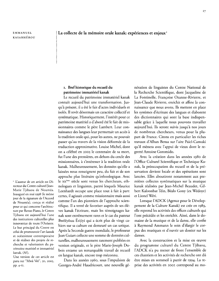 Actuellement, le peuple kanak de Nouvelle-Calédonie parle 28 langues austronésiennes. Au cours des dernières années, le Centre culturel Jean-Marie Tjibaou de Nouméa a commencé une collecte systématique de ce riche patrimoine immatériel afin de créer une archive de la littérature orale kanak. L’article analyse le projet de collecte et focalise l’attention sur la relation entre les collectionneurs et les personnes ressources, sur le rôle des conseils coutumiers dans l’orientation des activités de collecte, sur les critères de sélection des textes et sur l’éthique de la collecte et de la consultation.