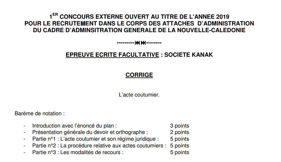 La direction des Ressources humaines et de la fonction publique de la Nouvelle-Calédonie (DRHFPNC) met à disposition sur son site des annales avec les sujets et corrigés des concours des années précédentes. Certaines épreuves nécessitent de connaitre le monde kanak.