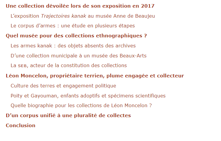 L’étude des collections kanak du musée Anne de Beaujeu illustre la difficulté que représente la recherche sur les provenances des collections extra-européennes. La collecte de beaucoup d’objets du Pacifique, et particulièrement des armes de Nouvelle-Calédonie, est souvent le fruit de confiscations à moins qu’elles ne soient des dons faits à des personnes qui, cependant, ne portent pas d’intérêt à la culture matérielle. Les changements institutionnels à la fin du xixe siècle et les transferts de collections, parfois mal renseignés, compliquent cette recherche. L’histoire des acteurs locaux met en lumière des aspects de leur relation avec la Nouvelle-Calédonie, Léon Moncelon étant particulièrement intéressant à cet égard.