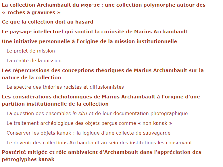 Le 30 juin 1909, Marius Archambault, directeur des Postes et Télégraphes à Nouméa, se voyait confier par l’État français une mission archéologique en Nouvelle-Calédonie. Le fonctionnaire s’intéressait déjà, depuis plus de dix ans, aux pétroglyphes présents sur la Grande Terre, productions qu’il croyait étrangères aux Kanak avec qui il cohabitait. Cherchant ailleurs l’origine de ces gravures sur roches, Marius Archambault collecta et documenta néanmoins des typologies d’objets kanak variées, qui dotent a posteriori sa mission d’un caractère ethnographique. Cet article vise, à travers l’étude d’un corpus issu de diverses institutions et aujourd’hui réuni au musée du quai Branly-Jacques Chirac, à éclairer le déroulement d’une mission, la pensée d’un homme et leurs conséquences sur la matérialité d’une collection ainsi que la persistance d’idées reçues.