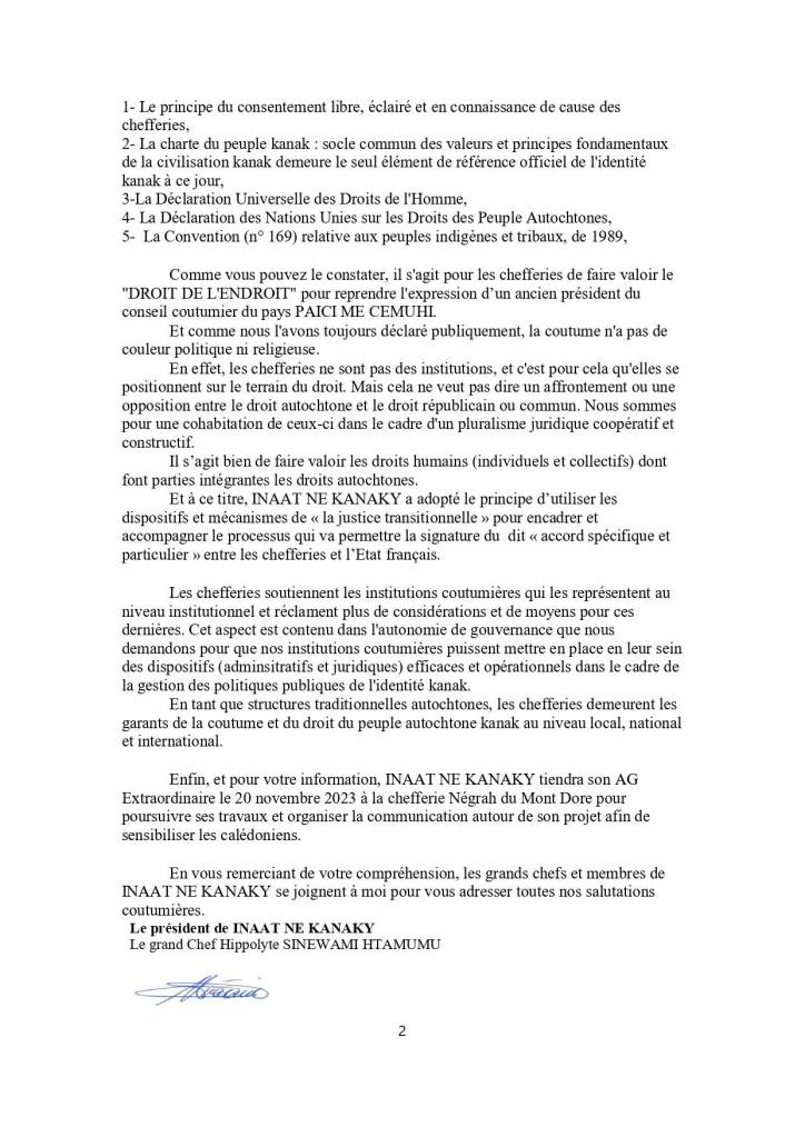 Communiqué de presse de INAAT NE KANAKY, Conseil National des Chefs de Kanaky aux partis politiques de la Nouvelle-Calédonie.
