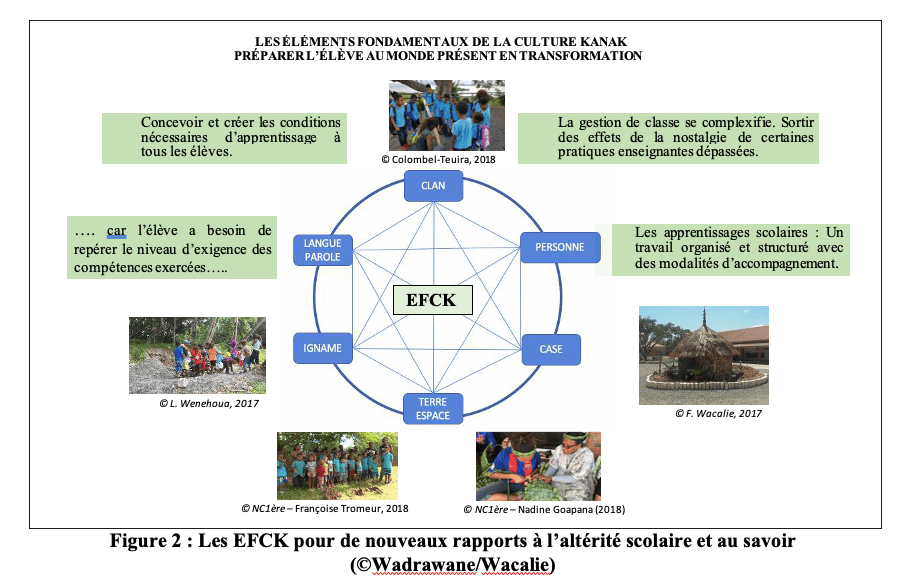 Depuis 2016, les Éléments Fondamentaux de la Culture Kanak (désormais EFCK) existent dans les textes institutionnels. Les nouveaux programmes de 2019 continuent de renforcer leur assise dans le système scolaire calédonien. Dans cette analyse nous projetons de revenir sur le « stage en immersion dans la tribu » et « se former en dehors » à Câba3 (Tchamba) en 2019. Nous tenterons par l’« approche symbiotique entre recherche et enseignement » (Astolfi, 1992 : 145), ainsi que formation, de démontrer en quoi et comment les EFCK peuvent intégrer les pratiques enseignantes et de formation. L’Inspé, composante interne de l’Université de la Nouvelle- Calédonie (désormais Unc), dispensait déjà un enseignement des langues et de la culture kanak. Depuis 2013, des stages en immersion en tribus isolées en province nord étaient organisés mutuellement par l’association Câba et l’Inspé-Unc. Durant ce stage d’immersion dans la tribu donnant l’occasion aussi à « se former en dehors », le jeune enseignant apprend à découvrir son milieu d’exercice, l’univers de l’élève scolarisé en tribu et à s’acclimater aux savoirs et connaissances relevant des techniques de vie de la tribu. Le positionnement officiel de l’enseignement des EFCK dans le Projet Éducatif de la Nouvelle-Calédonie (désormais PENC) donne la possibilité à avoir recours à la transposition didactique. L’école sera l’instrument de réalisation de ces nouvelles orientations éducatives (philosophie et contenu didactique) et de construction du vivre ensemble et du destin commun. Avant d’avancer nos arguments pour montrer pourquoi il est temps d’articuler les savoirs exogènes et endogènes présents dans la société calédonienne rappelons succinctement quelques éléments de l’histoire où la notion de