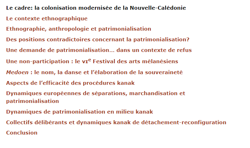 source : Denis Monnerie, “Résistances à la patrimonialisation. Agentivités, créativités et souveraineté kanak (Arama et nord Hoot ma Whaap, Nouvelle-Calédonie)”, Journal de la Société des Océanistes [Online], 142-143 | 2016, Online since 31 December 2018, connection on 04 September 2024. URL: http://journals.openedition.org/jso/7576; DOI: https://doi.org/10.4000/jso.7576