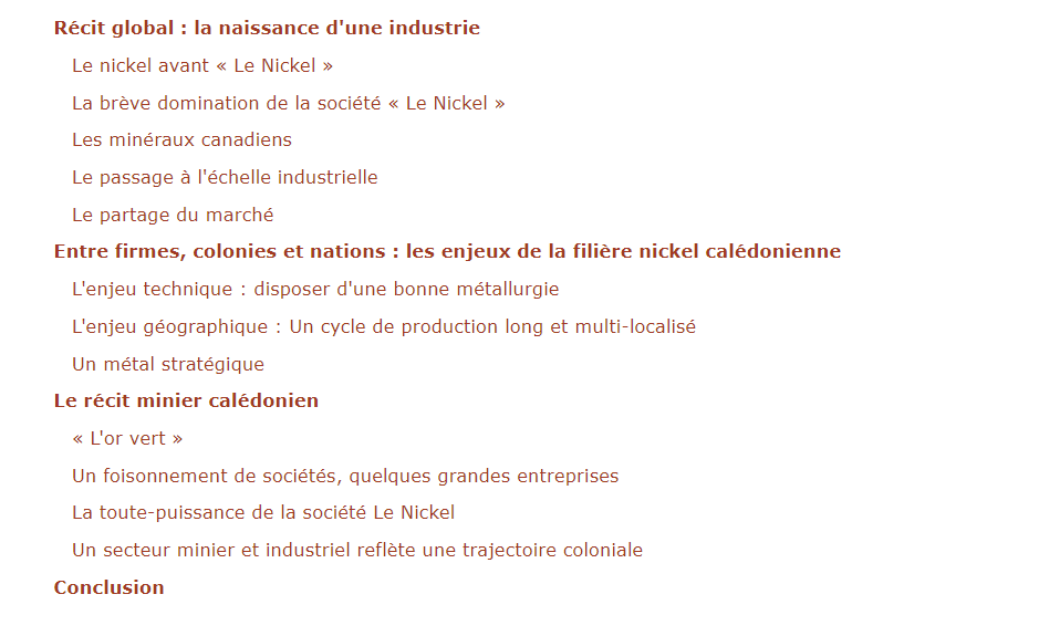 Le nickel est longtemps resté un métal marginal utilisé dans la fabrication de produits de luxe. L’industrie du nickel démarre avec la découverte de gisements en Nouvelle-Calédonie en 1875. Elle profite du développement des aciers au nickel qui se conjugue avec la course aux armements. Trois histoires s’entremêlent alors : l’ histoire globale d’ un secteur industriel qui s’impose à l’échelle mondiale au cours des trente années précédant la Première Guerre mondiale ; les défis qu’il représente pour les grandes entreprises , les nations et leurs rivalités impériales ; et enfin, l’ histoire minière calédonienne qui se déroule dans le contexte de la colonisation .