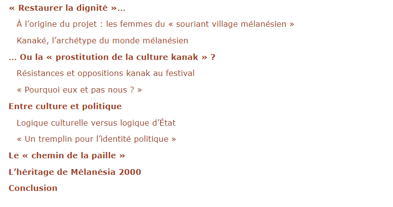source : Caroline Graille, “1975-2015 : retour sur Mélanésia 2000, symbole de la renaissance culturelle kanak”, Journal de la Société des Océanistes [Online], 142-143 | 2016, Online since 31 December 2018, connection on 03 September 2024. URL: http://journals.openedition.org/jso/7570; DOI: https://doi.org/10.4000/jso.7570