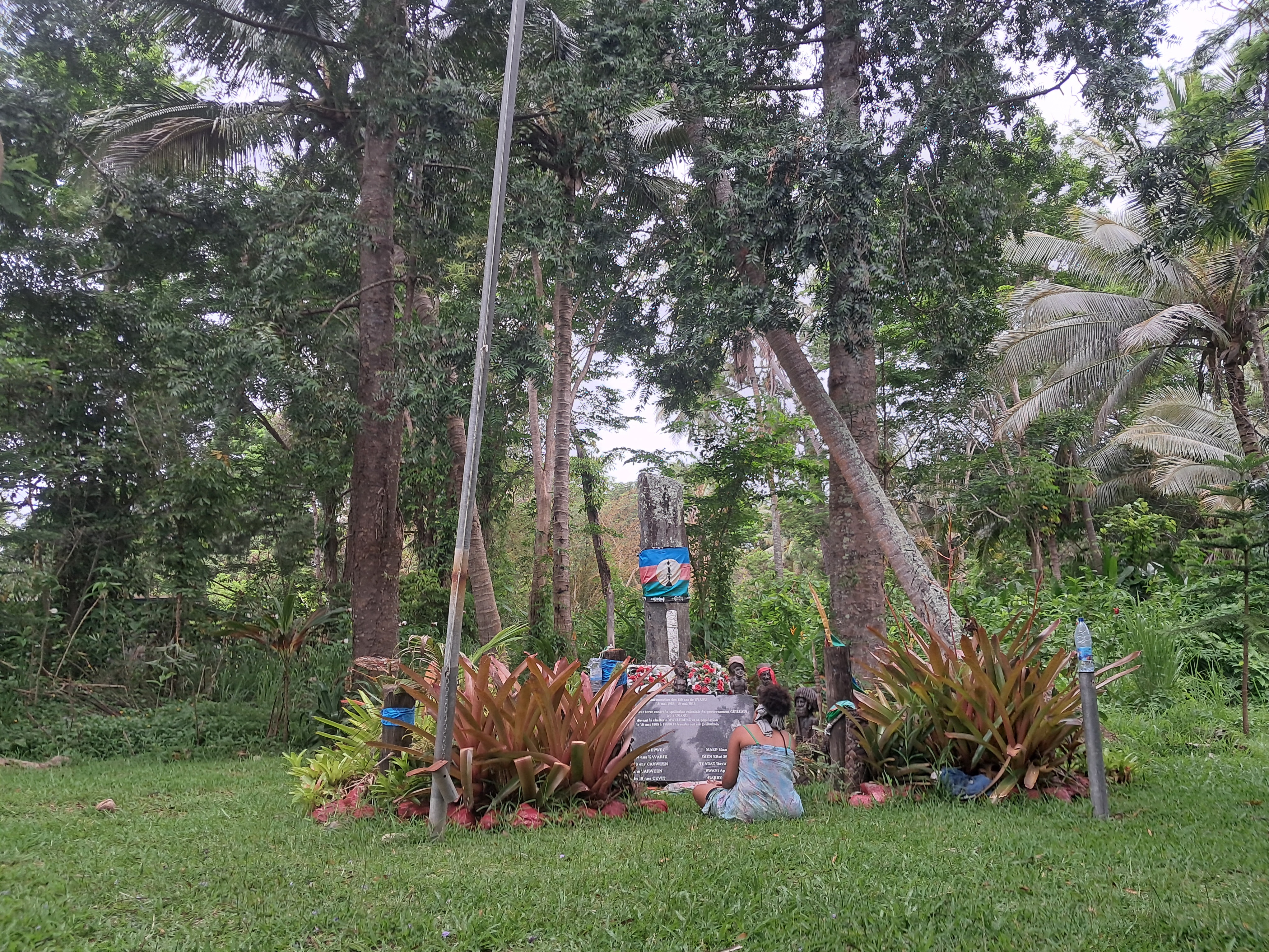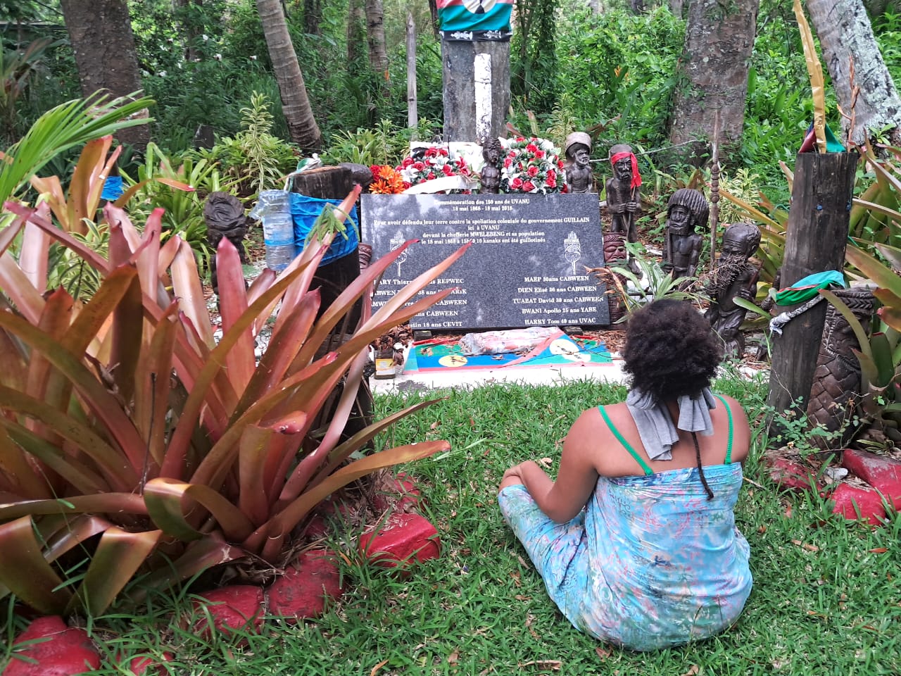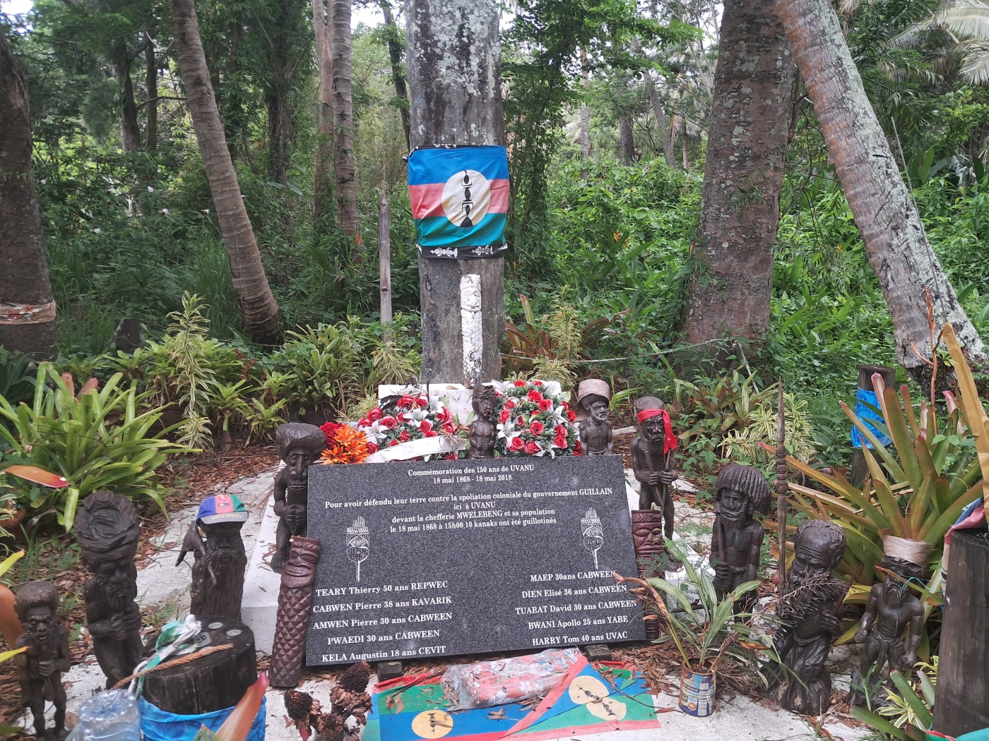 Le message gravé en tête de la stèle est clair : « Pour avoir défendu leur terre contre la spoliation coloniale du gouverneur Guillain, ici à Ouvanou, devant la chefferie Mwelebeng et sa population, le 18 mai 1868 à 15h00, 10 Kanaks ont été guillotinés ».