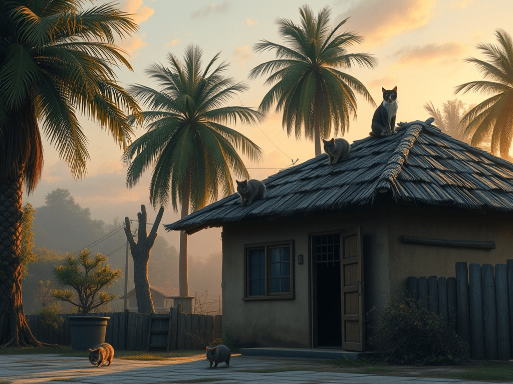 La nuit, les chats montent sur le toit. Leurs pas résonnent sur la tôle, comme une patrouille silencieuse. Parfois, on les voit sauter depuis la toiture avec une agilité féline — surpris, on comprend alors qu’ils montaient la garde au-dessus de nos têtes.
