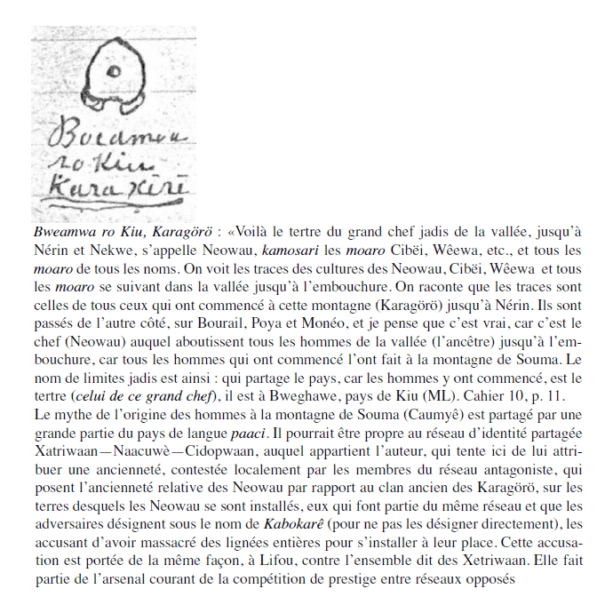 Au travers de ses récits, de ses notes, il décrira l’origine des chefferies et des familles, les formules rituelles ce qui fera de lui un des hommes les plus contestés de la tradition culturelle kanak puisqu’il sera un des tous premiers à passer de l’oralité à l’écrit.