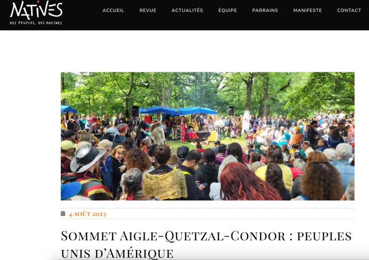 En août 2023, l’Association Présence Kanak a fait un geste de coutume lors du grand Sommet Aigle-Quetzal-Condor. Nous sommes revenus sur cette journée dans un article co-écrit avec notre partenaire Revue Natives. Cliquer sur l’image pour accéder à l’article.