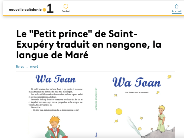 Germaine Nemia Bishop a réalisé la toute première traduction du Petit Prince en langues Kanak. Elle répond aux questions de NC 1ère. Cliquer sur l’image pour accéder à l’article.