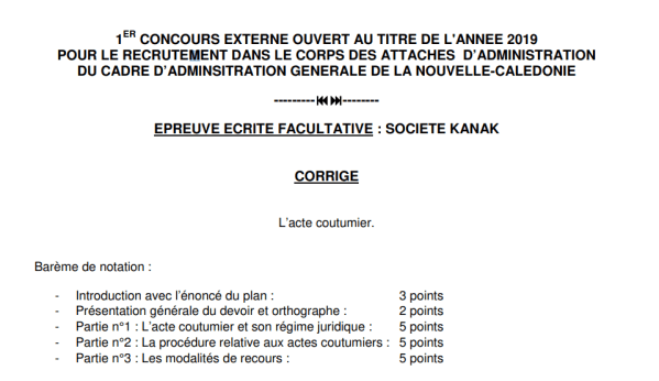 La direction des Ressources humaines et de la fonction publique de la Nouvelle-Calédonie (DRHFPNC) met à disposition sur son site des annales avec les sujets et corrigés des concours des années précédentes. Certaines épreuves nécessitent de connaitre le monde kanak. Corrigé : Assesseurs coutumiers et officiers publics coutumiers : statuts et fonctions Jusqu'en 1990, les plaideurs de... Lire la Suite →