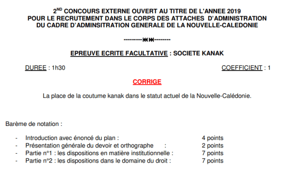 La direction des Ressources humaines et de la fonction publique de la Nouvelle-Calédonie (DRHFPNC) met à disposition sur son site des annales avec les sujets et corrigés des concours des années précédentes. Certaines épreuves nécessitent de connaitre le monde kanak. Corrigé : L’accession au statut civil coutumier L’origine des statuts personnels particuliers est coloniale. Il s’agissait pour... Lire la Suite →